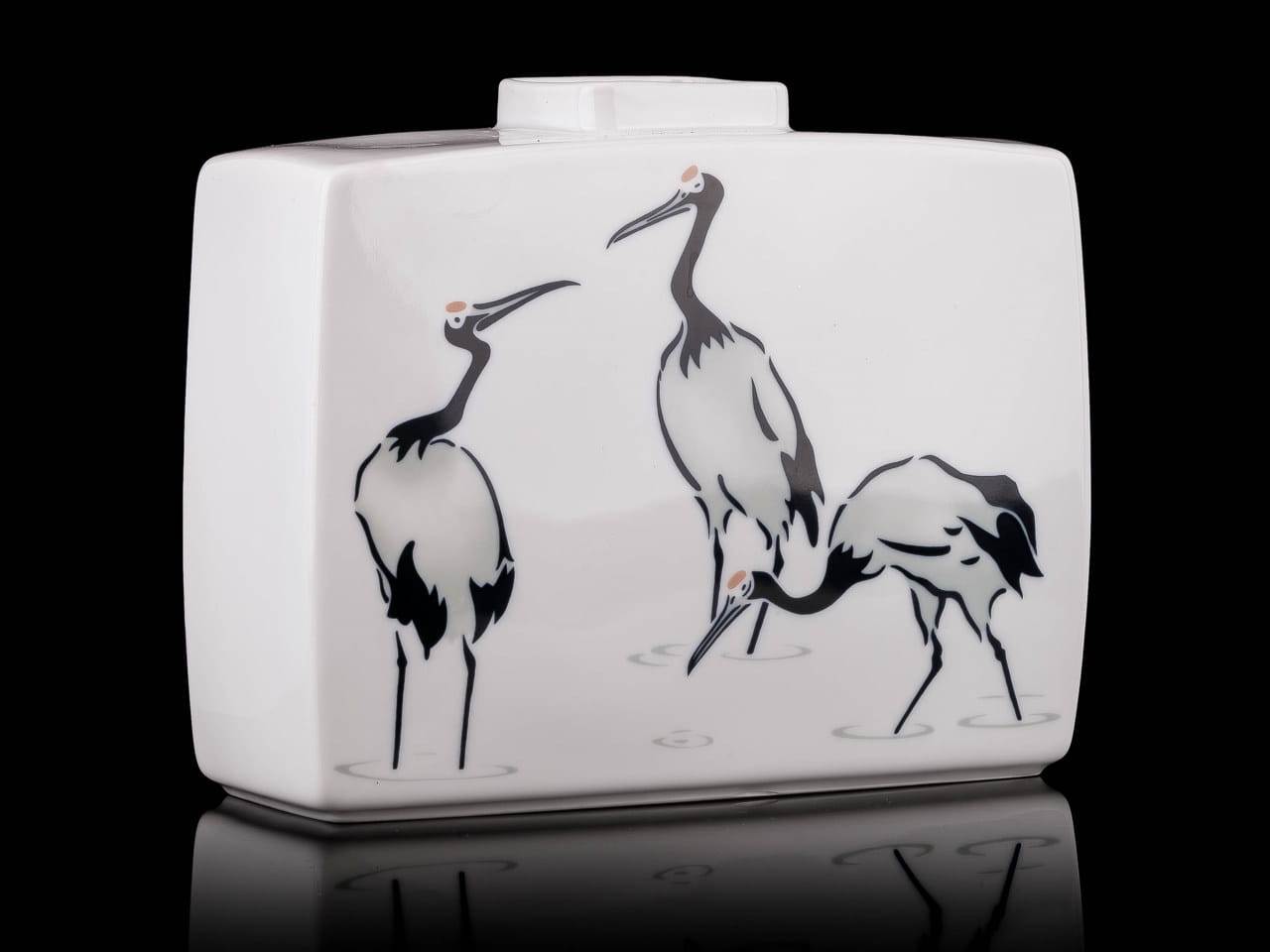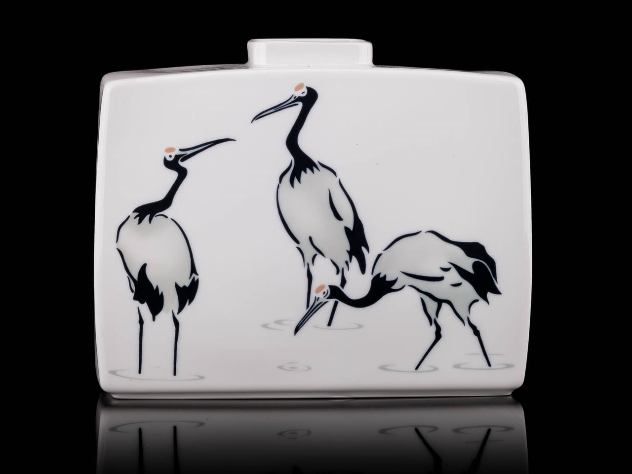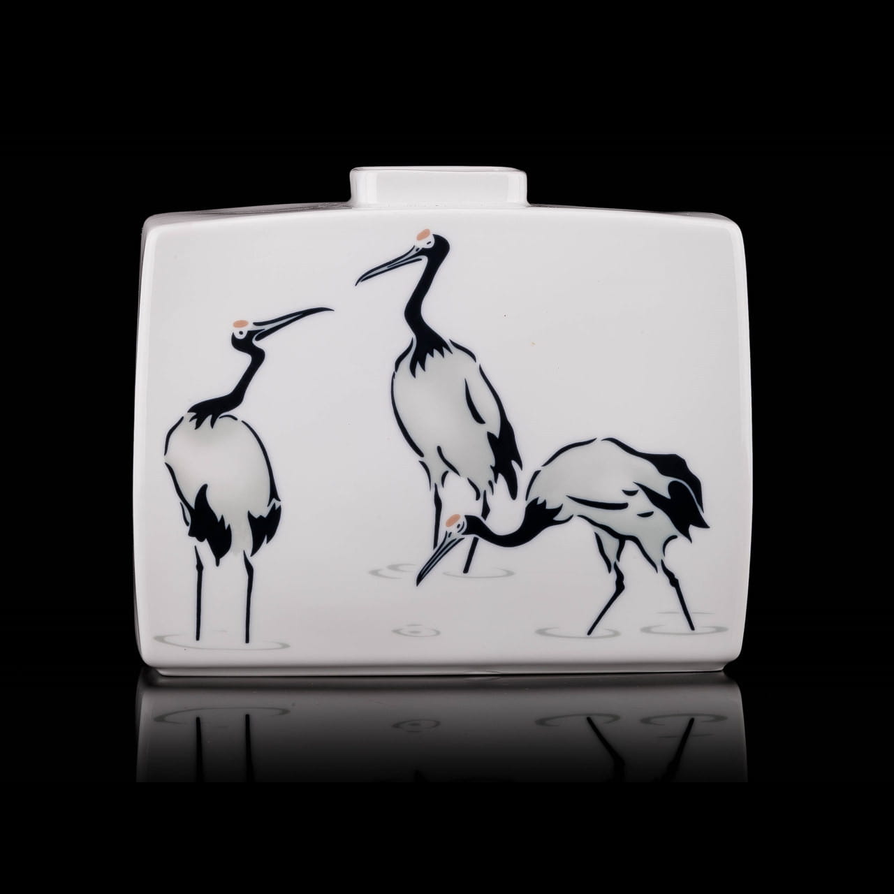 Wazon designerski, w formie prostokątnej z umieszczonymi, ręczni malowanymi trzema żurawiami.