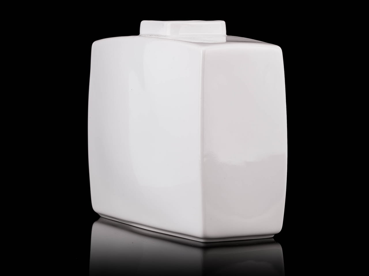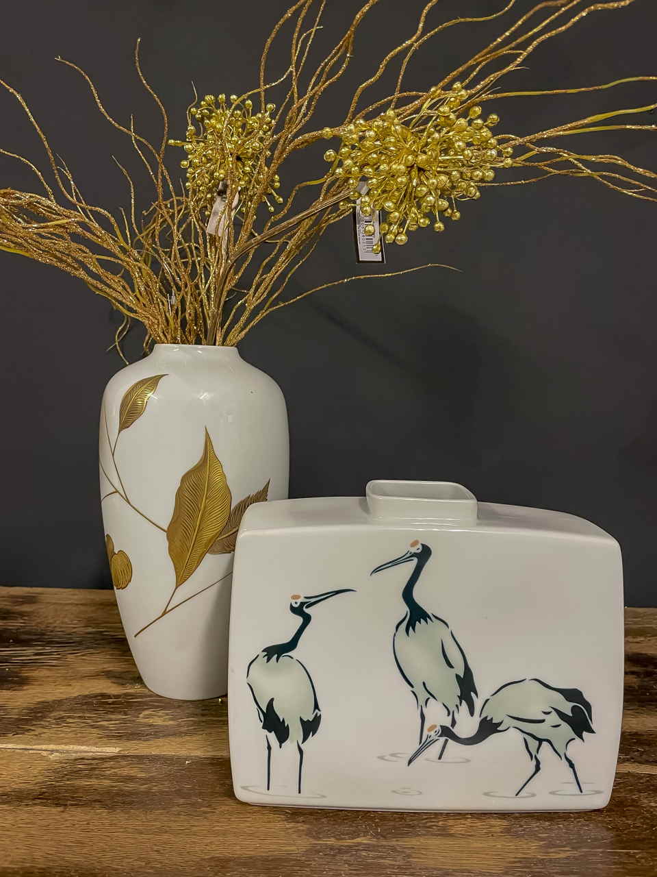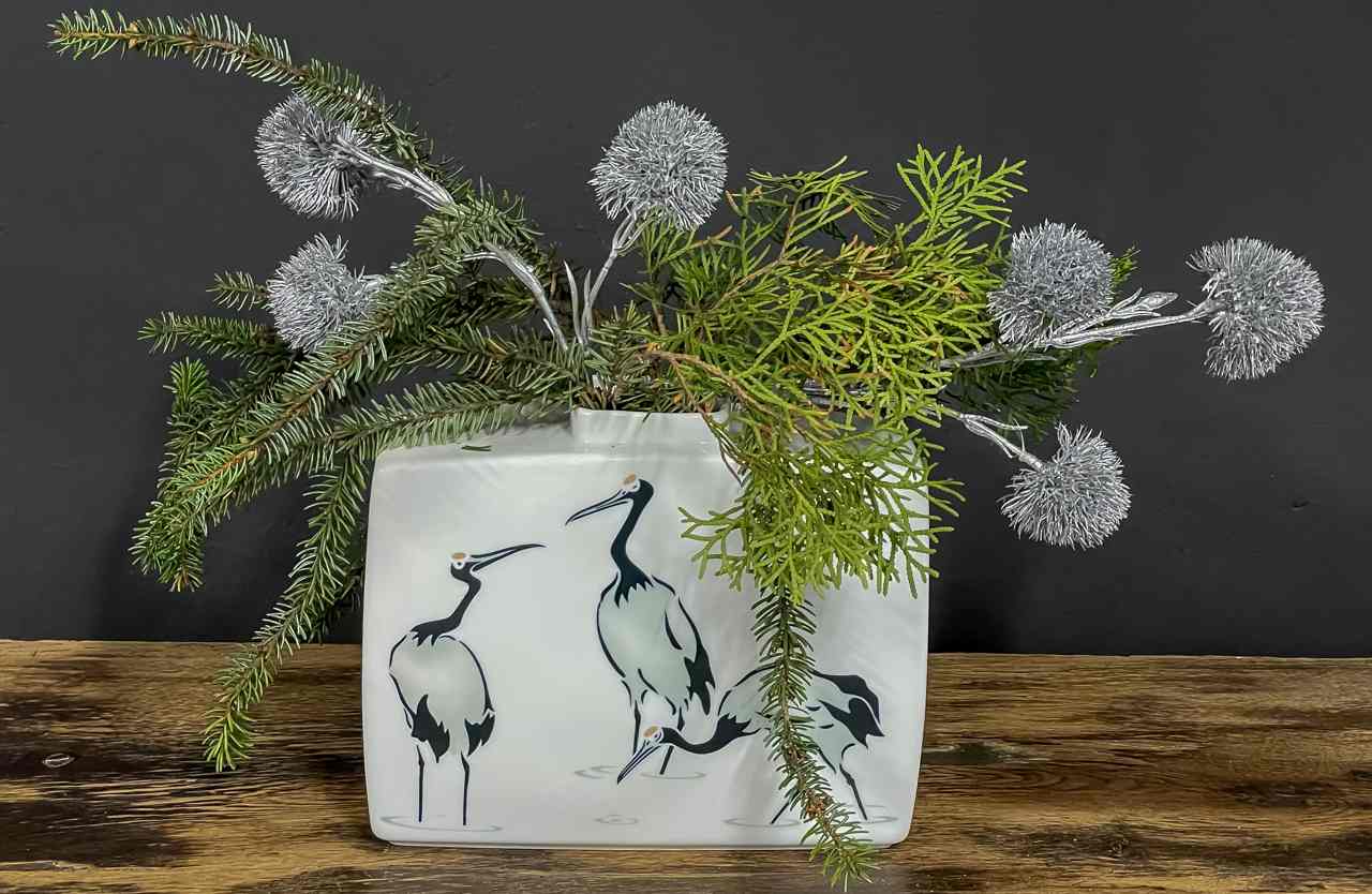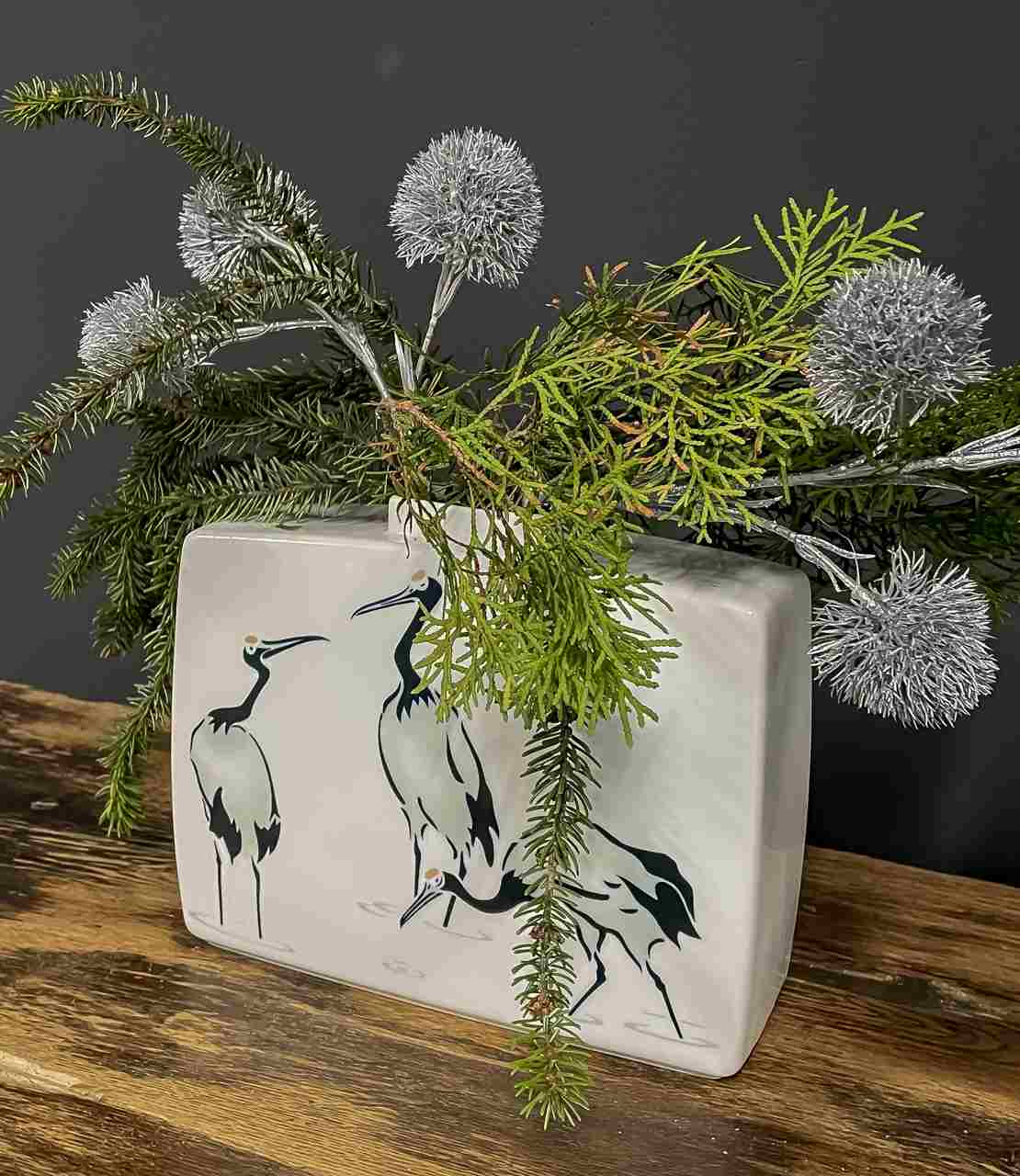 Wazon designerski, w formie prostokątnej z umieszczonymi, ręczni malowanymi trzema żurawiami.