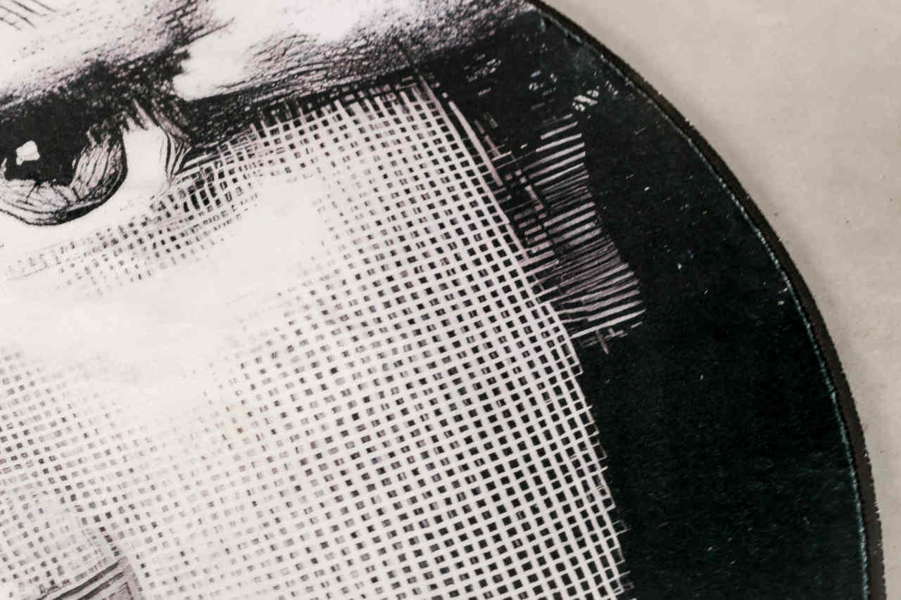 Postmodernistyczny okrągły dywan w stylu Piero Fornasetti, którego motywem jest Twarz śpiewaczki operowej Liny Cavalieri.