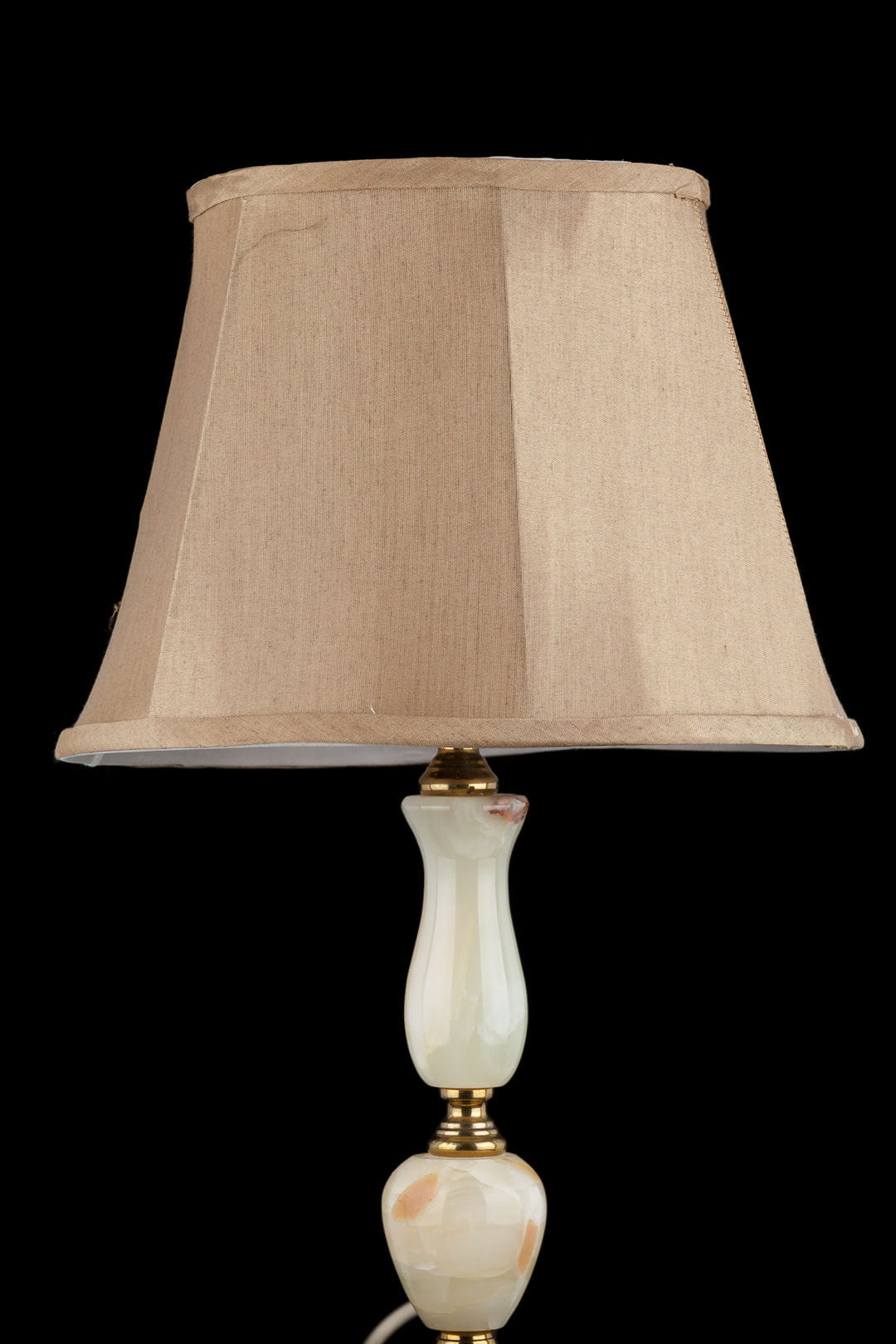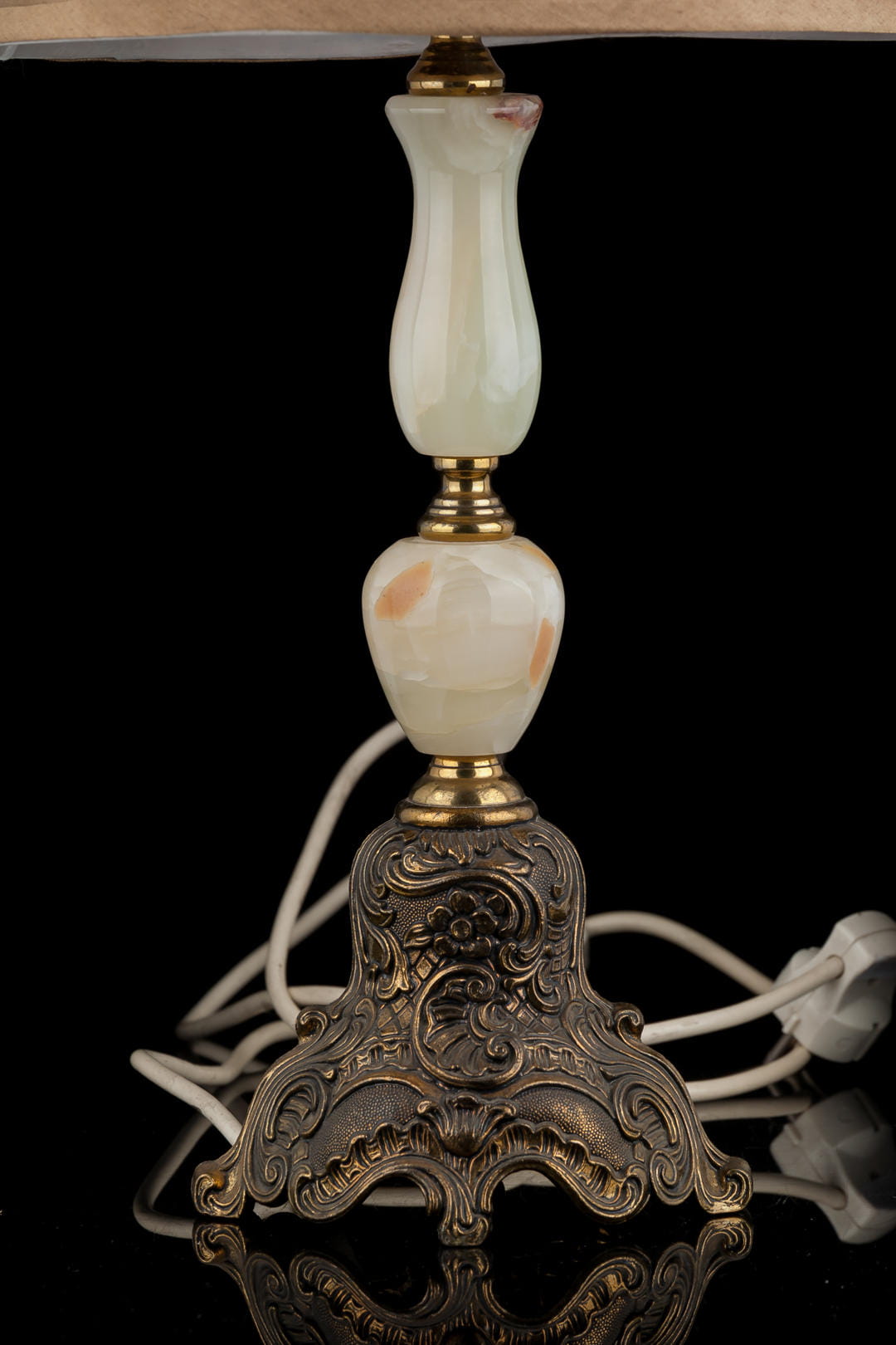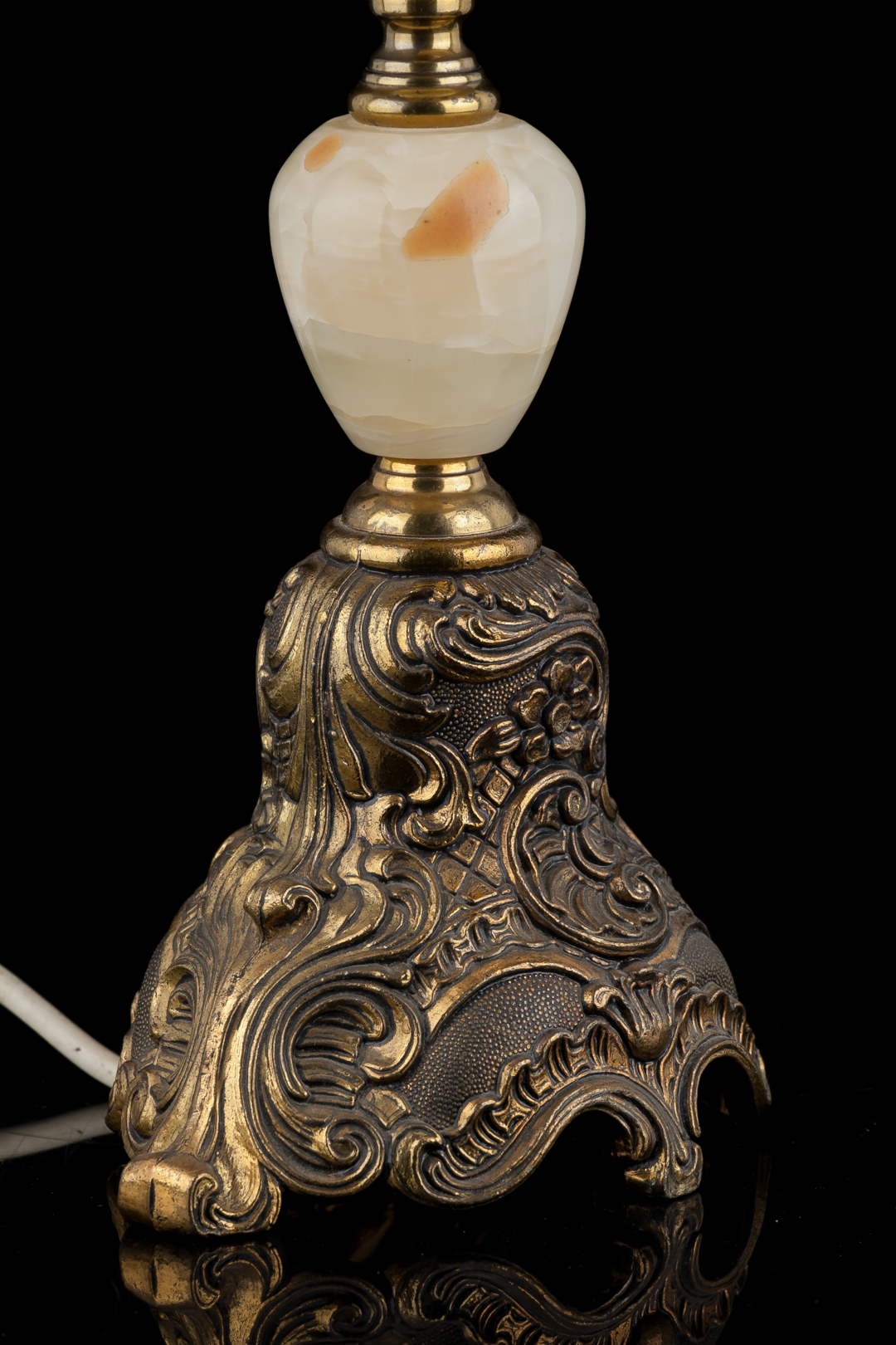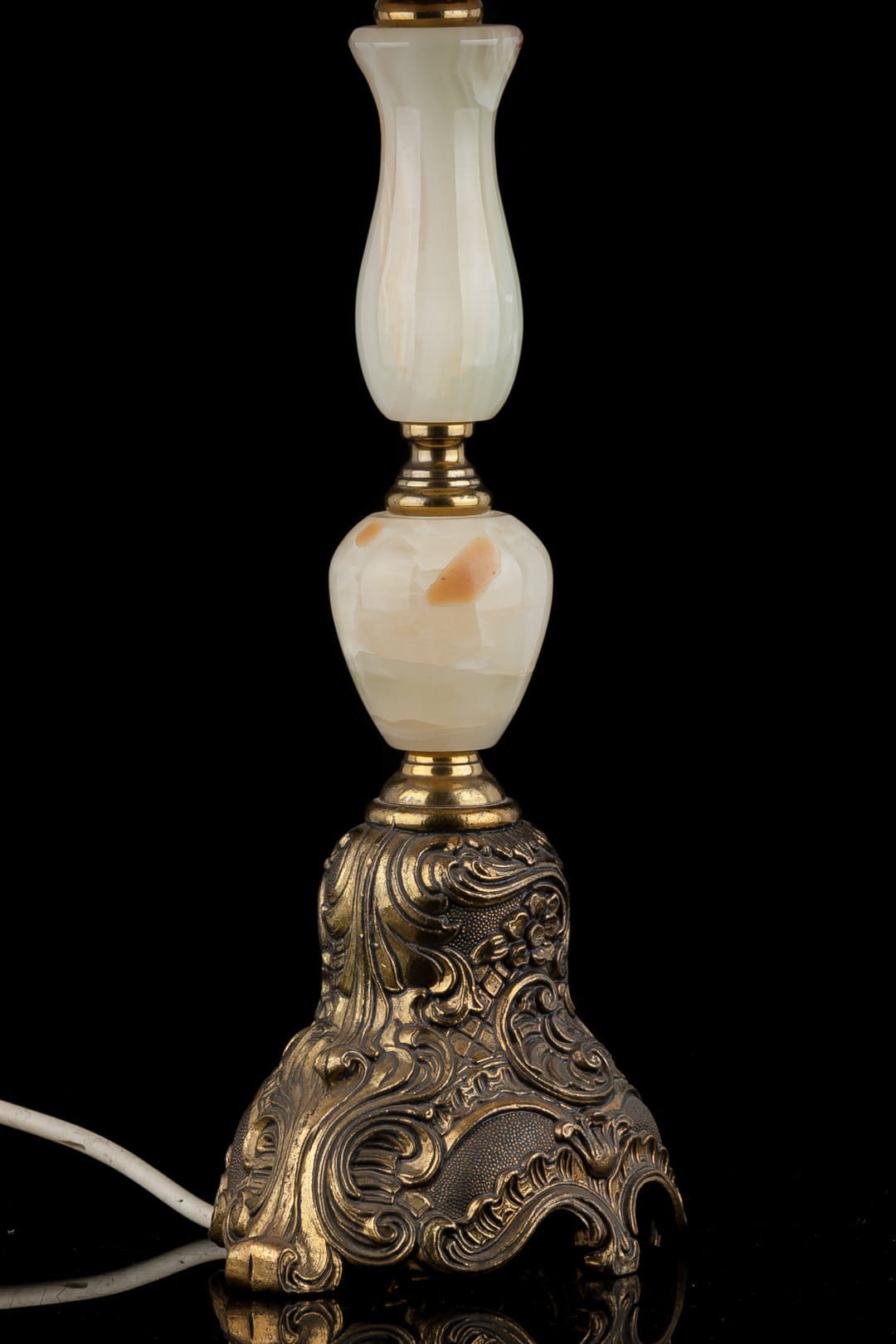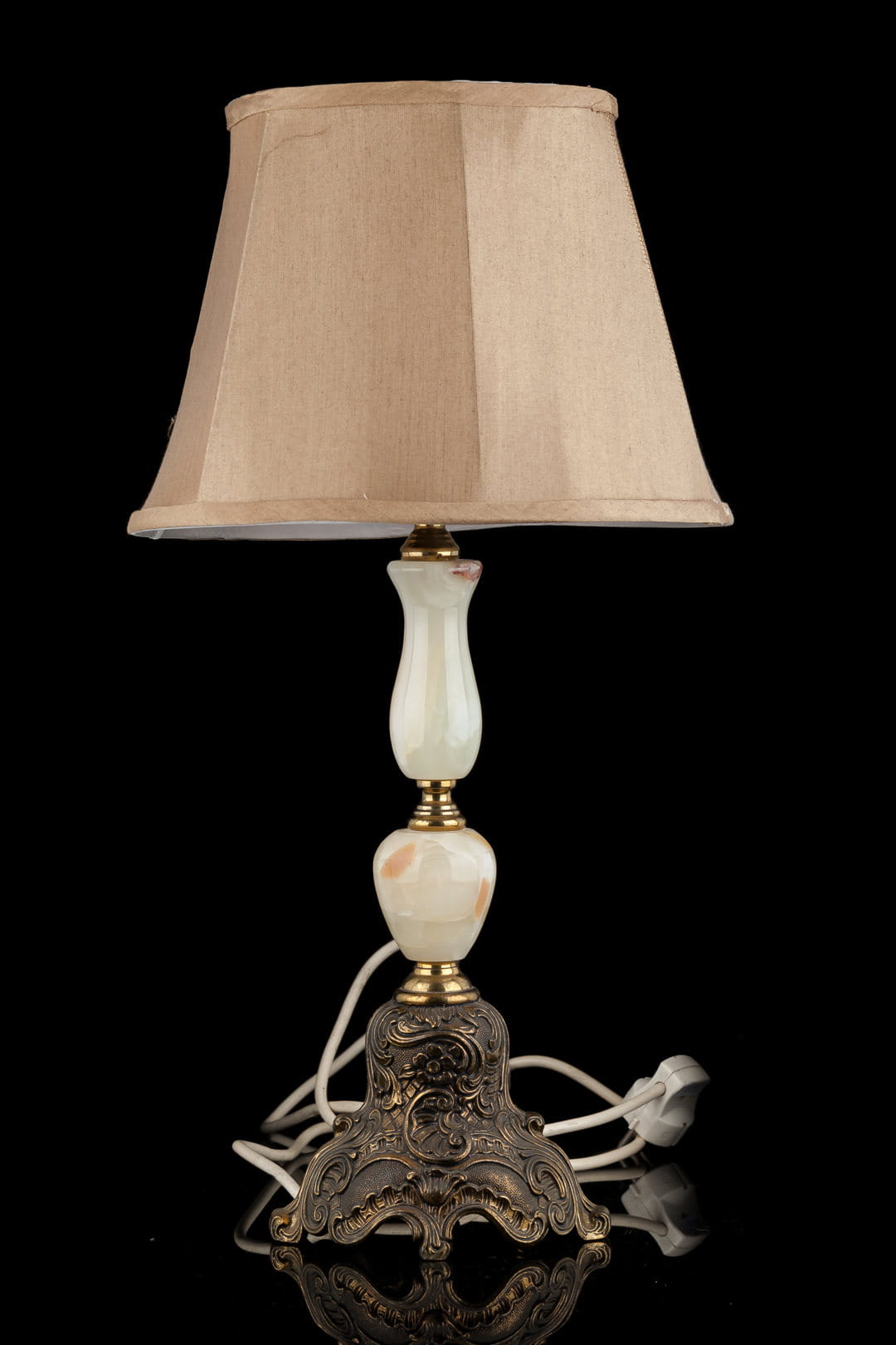 Lampa stołowa wykonana z mosiądzu i kamienia onyxu.