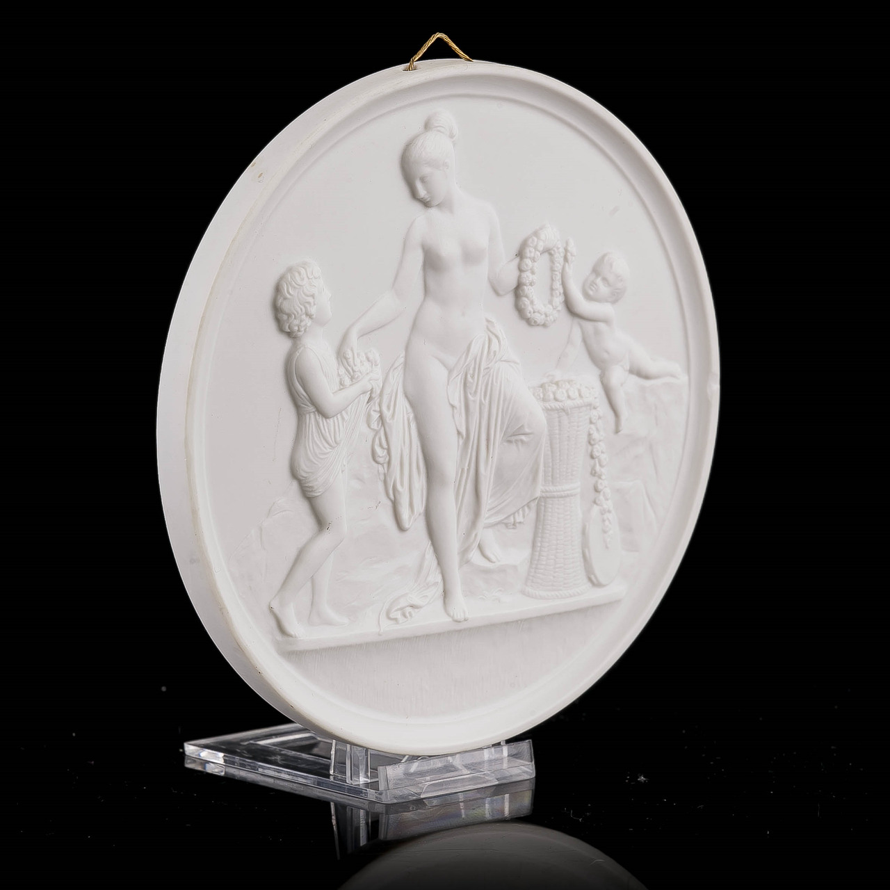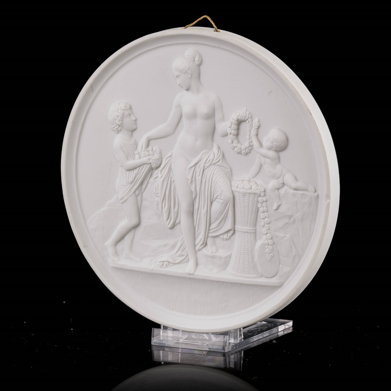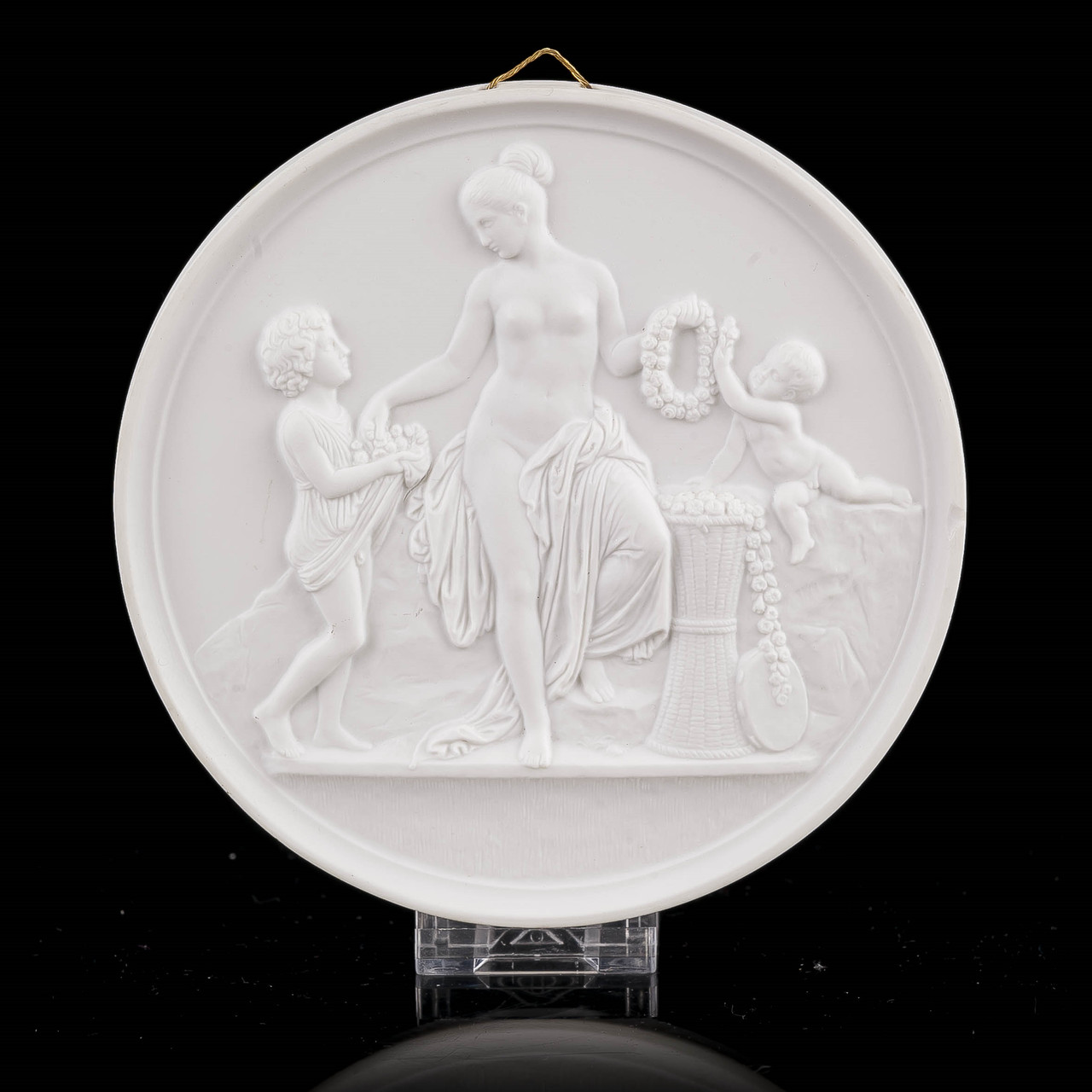 Porcelanowa okrągła plakieta ścienna, z pięknymi reliefowymi scenkami. Biała biskwitowa(matowa) porcelana zachowana w idealnym stanie.