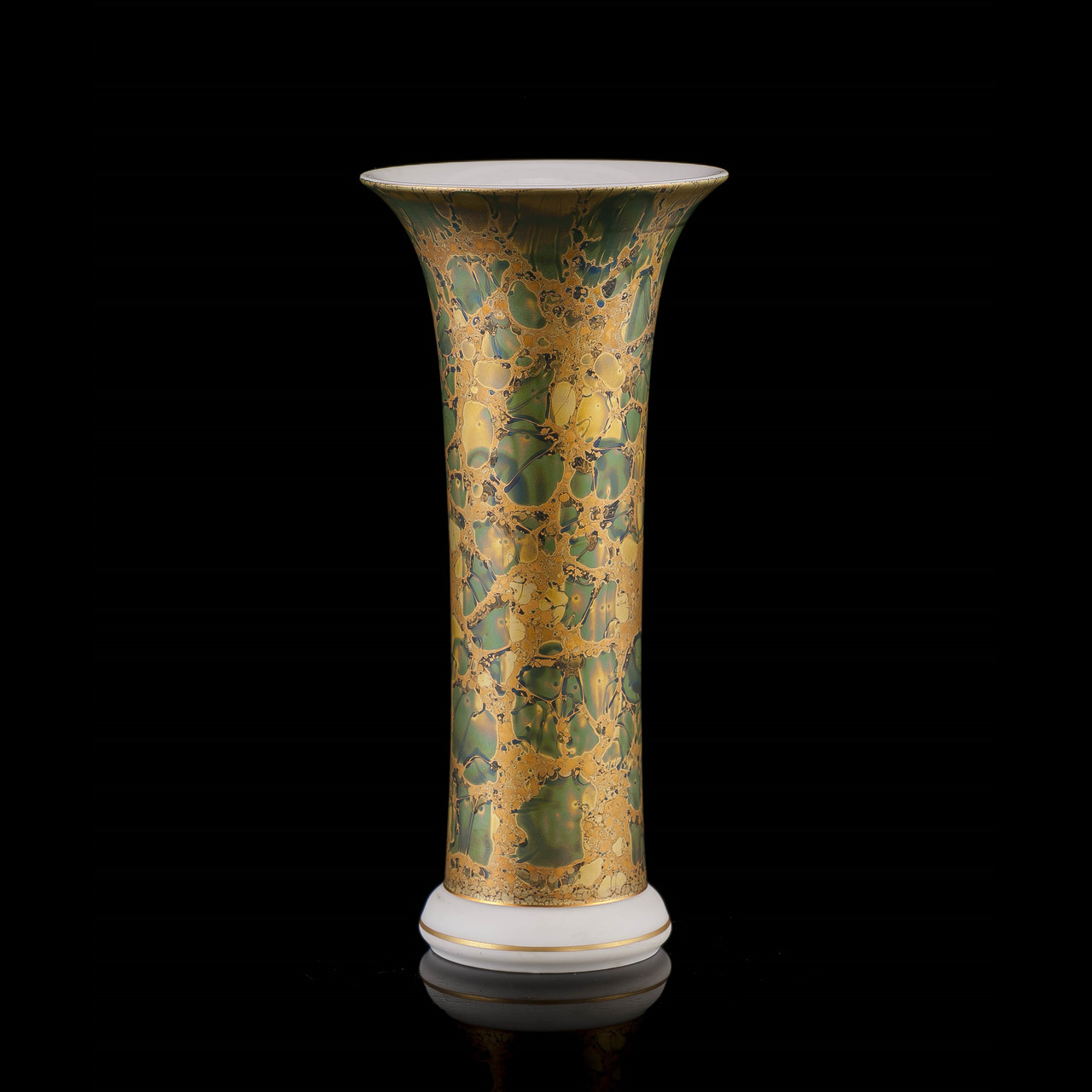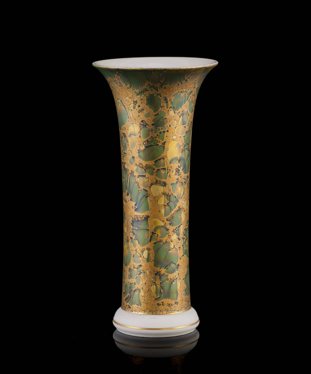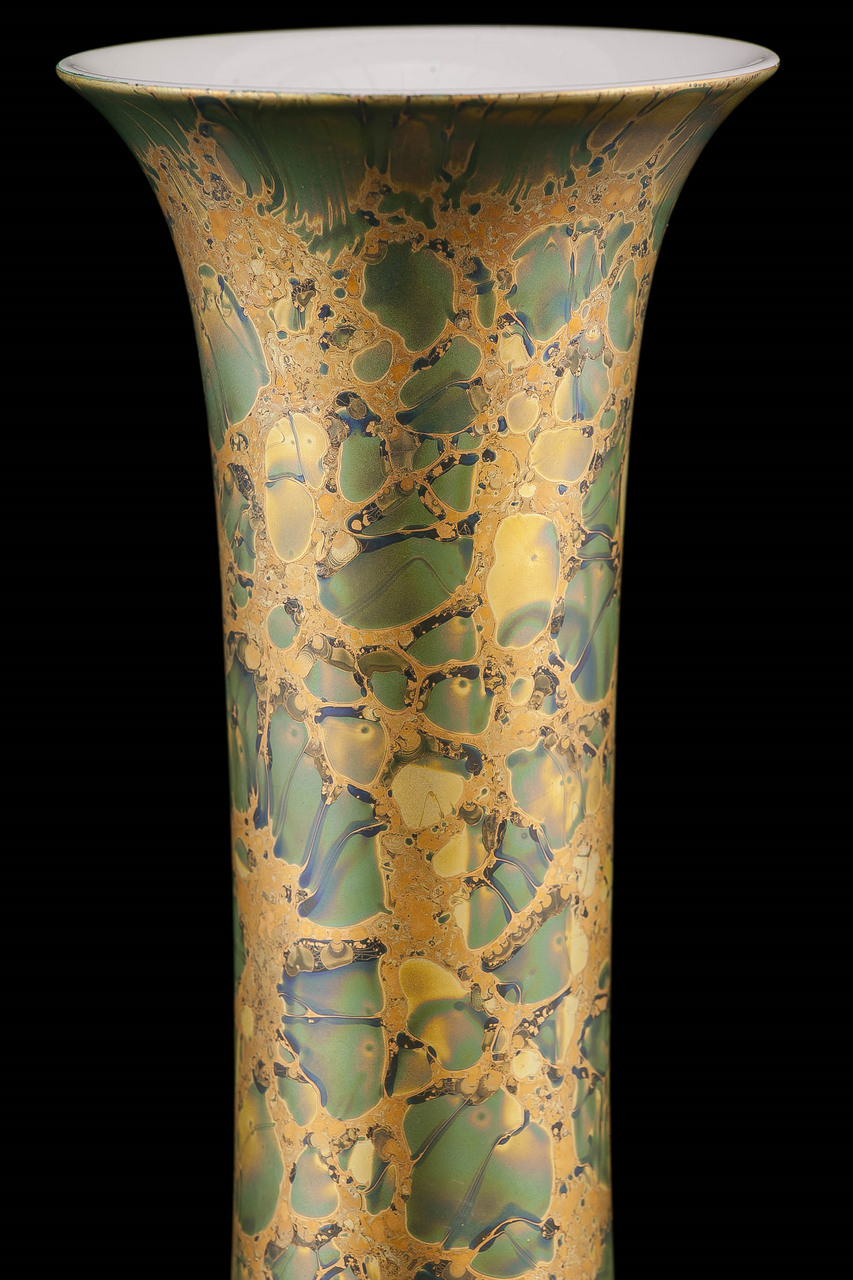 Prezentowany wazon z porcelany pokryto charakterystyczną dla Helmuta Drexlera emalią eozynową, co nadaje mu olśniewający, marmurkowy wygląd.