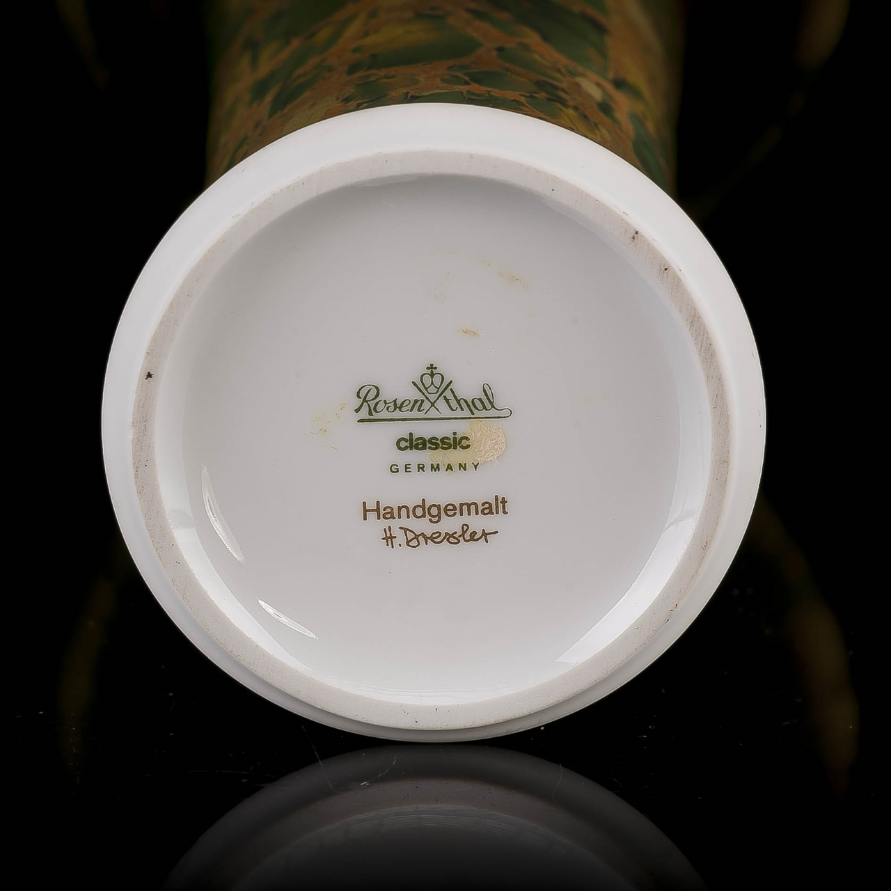 Oznaczony na spodzie napisem „Rosenthal Germany, oraz napisem „Handbemalt H. Drexler”.