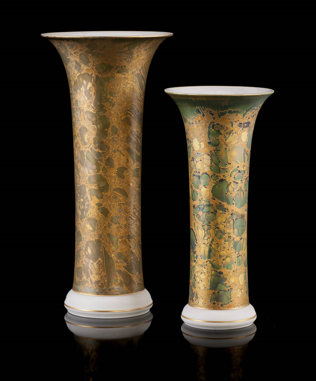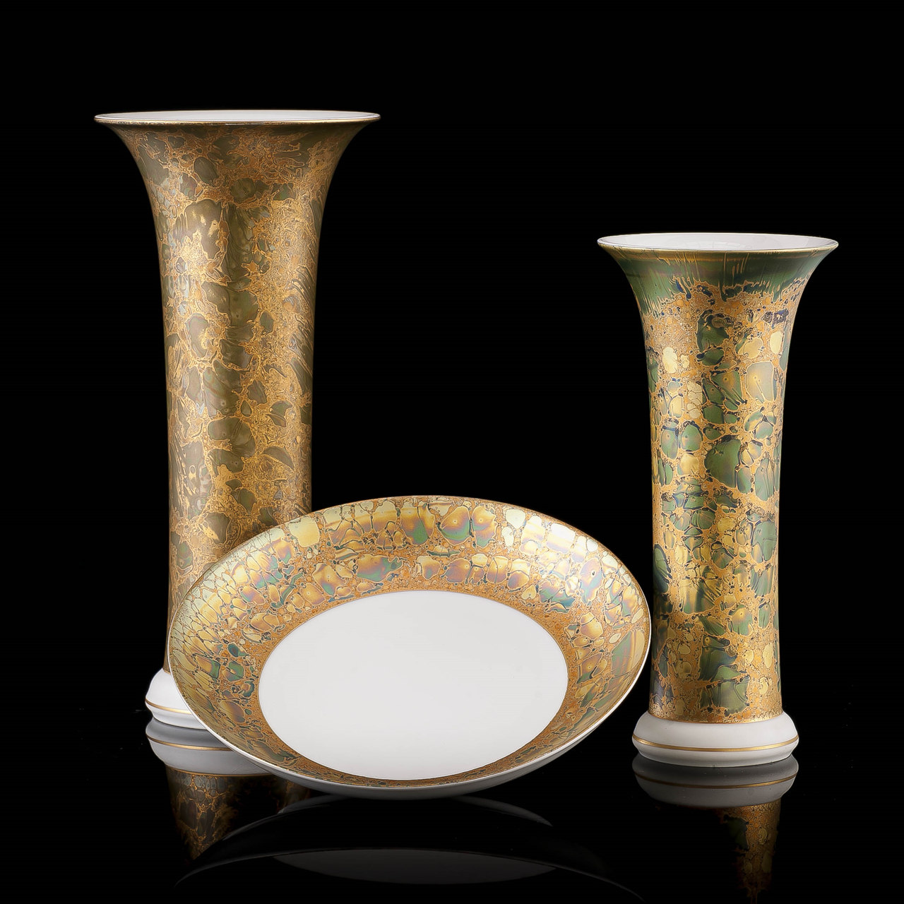 Helmut Drexler był wpływową postacią w firmie Rosenthal, cenioną za mistrzostwo w zdobieniu powierzchni ceramicznych. Zastosowana przez niego technika szkliwienia eozyną, widoczna w tych wazonach, pozwala na uzyskanie hipnotyzującej gry opalizujących kolorów, w których harmonijnie mieszają się odcienie złota, fioletu i zieleni. Technika eozynowa polega na dodaniu do szkliwa tlenków metali, co nadaje powierzchniom charakterystyczny połysk, przypominający wczesne światło świtu — stąd nazwa „Eos”.